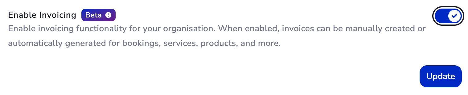 Scroll down until you find the Enable Invoicing option. Click the Update button to enable invoicing for your organisation.