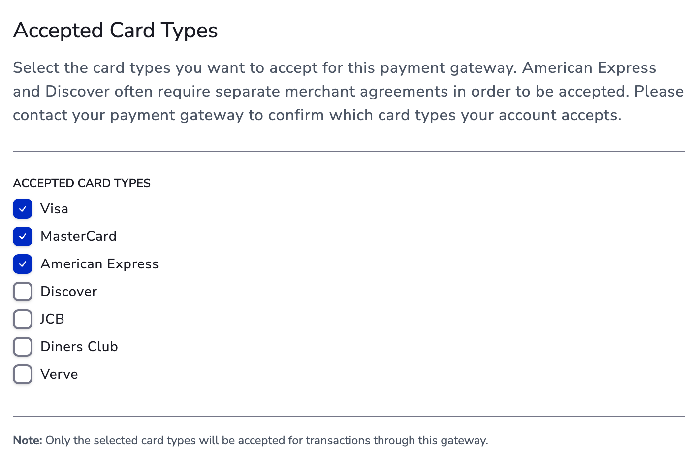 - Set your accepted card types — make sure they are also supported and enabled on your gateway account.