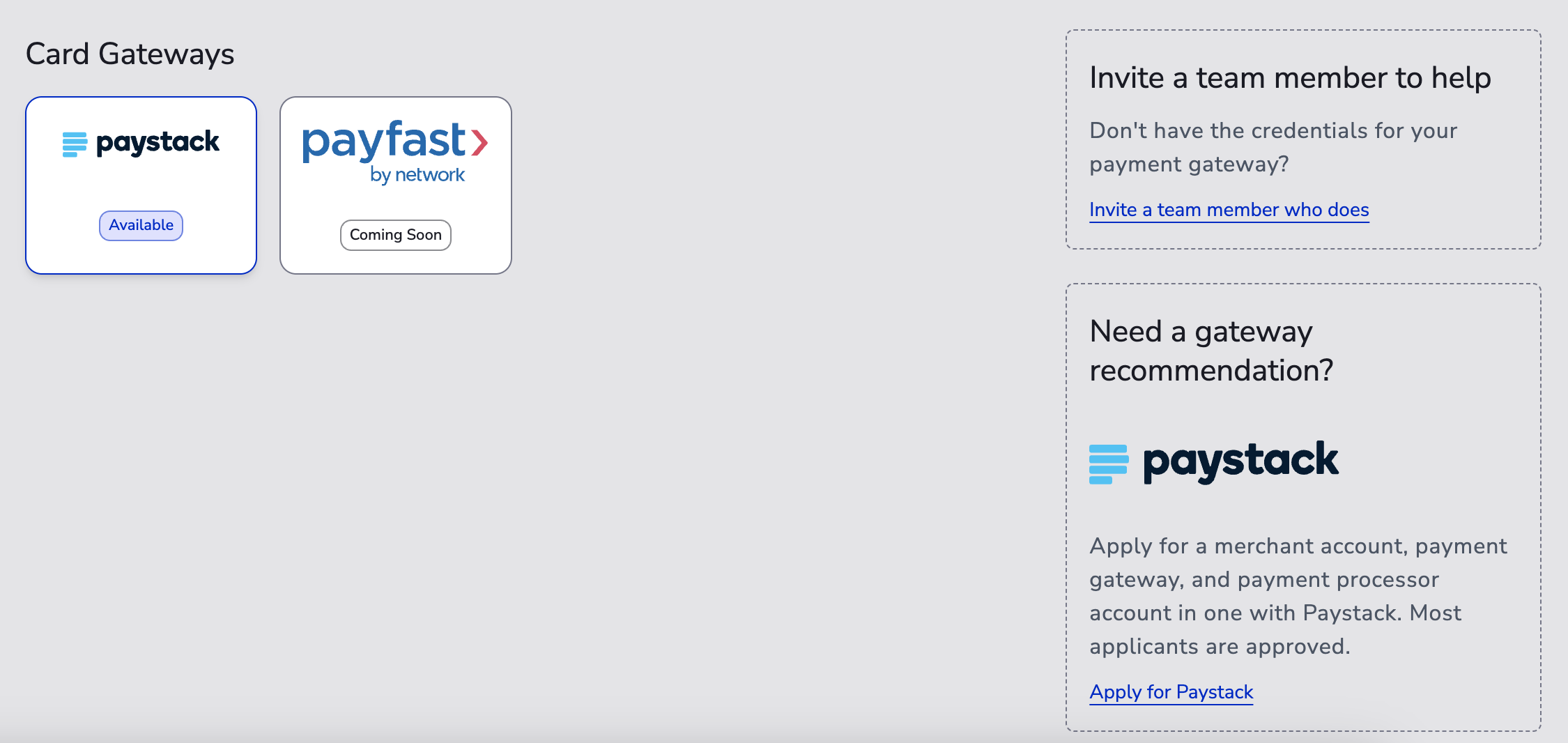 - Select your payment gateway (ensure your company country settings match in your Business Entity).