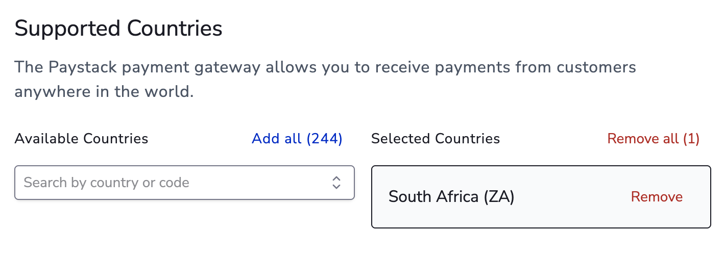 - Set the supported country to match the country where your gateway account is registered.