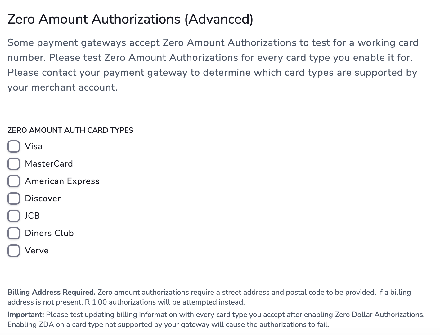 - Configure Zero Dollar Authorization (ZDA) settings if applicable.