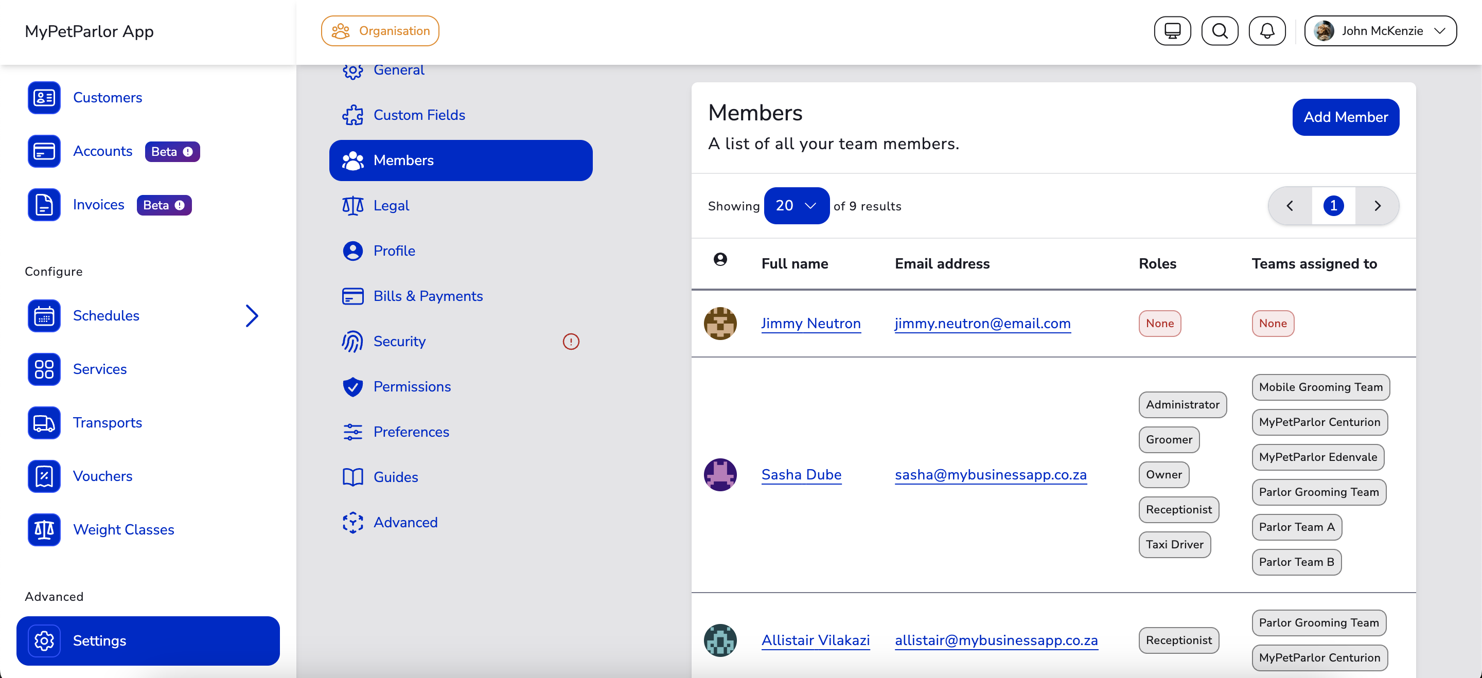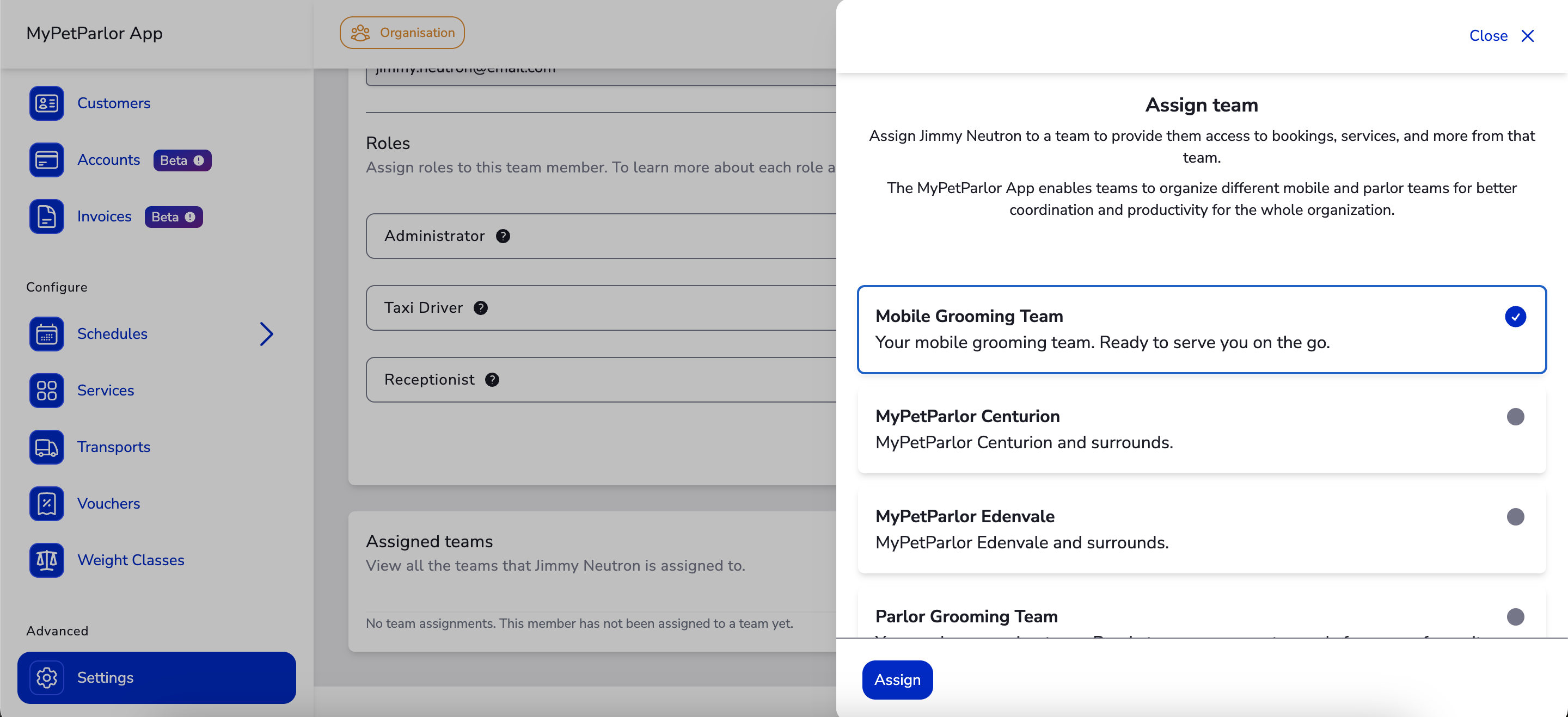 MyPetParlor App organises bookings into dedicated spaces called teams. Assign members to teams to bring the right people and information in your organisation together in one place.